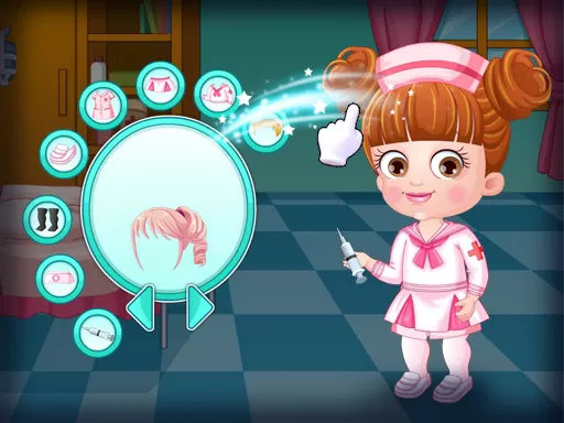 Dress up darling Baby Hazel in stylish doctor uniform and accessories. Give her good-looking stylish doctor white coat, nursing cap, accessories, hair styles, shoes and more. Handover Baby Hazel the best medical tools of your choice. Be quick for she need to reach hospital on time and look after the patients.